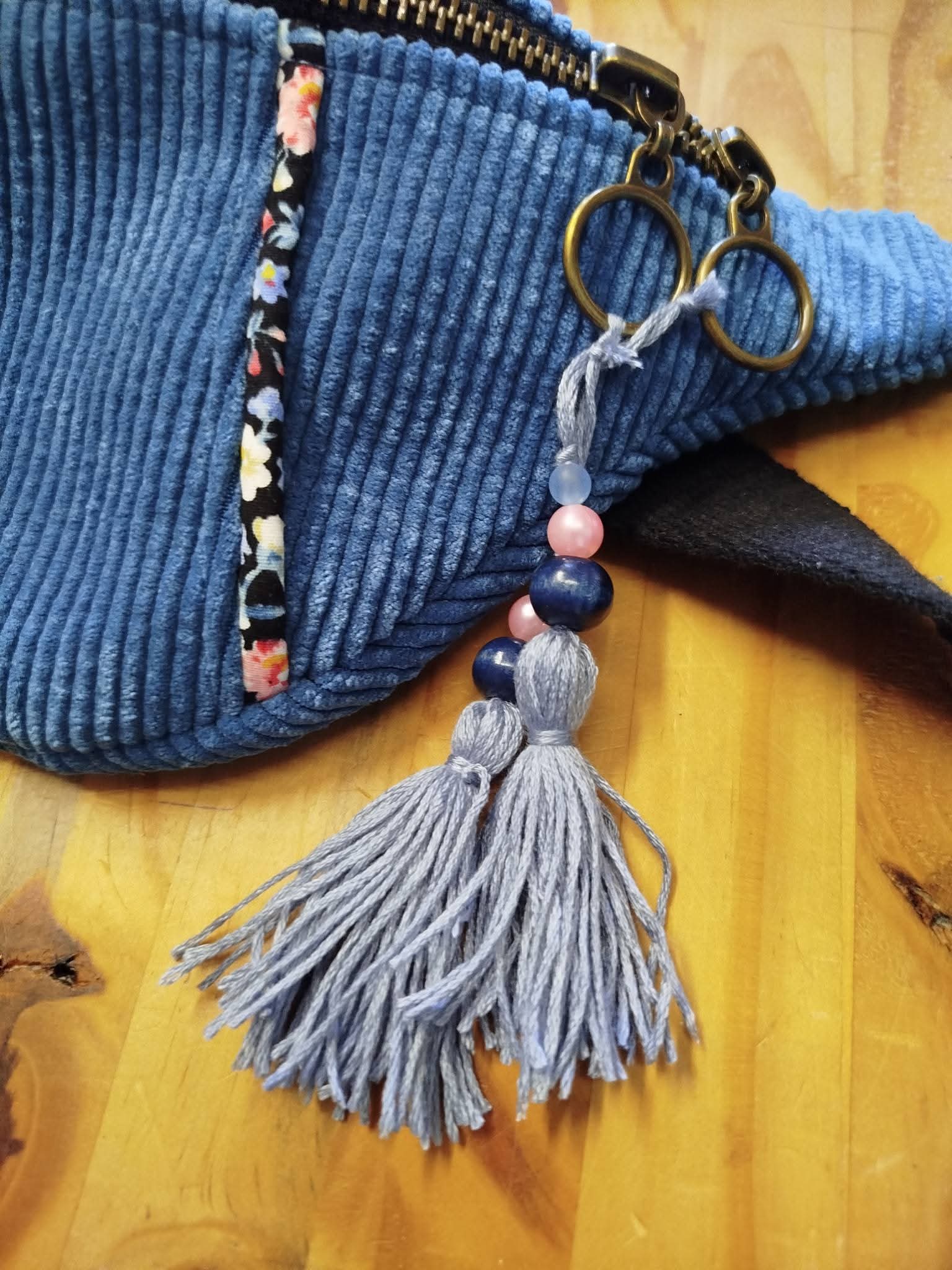 Version velours avec pompon et perles fait main avec une fantaisie sur la partie avant.